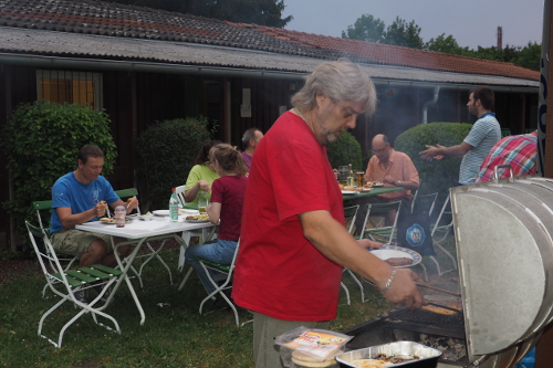 Wie alljährlich, so kamen auch in diesem Jahr kurz vor den Sommerferien, am Freitag, den 18. Juli 2015, wieder einige DJK-Mitglieder zum Sommer-Grillfest auf das Jugendfußball-Gelände an der Meraner Straße in Lechhausen. Unser „Neu"-Mitglied Reiner Krais spendete zum Einstand ein Fass selbstkühlendes Tucher-Bier. Vielen Dank dafür von allen Nutznießern. Nachdem Peter im nahen Bauhaus Grillkohle und Anzünder beschafft hatte, züngelte bald das Feuer im Grill und jetzt konnten auch die ersten Würste und Fleischstücke aufgelegt werden. Die von einigen Grillfreunden mitgebrachten Salate wurden aufgeteilt. Und wer sein Grillgut nicht selbst ganz aufessen konnte, fand immer einen noch hungrigen Abnehmer.