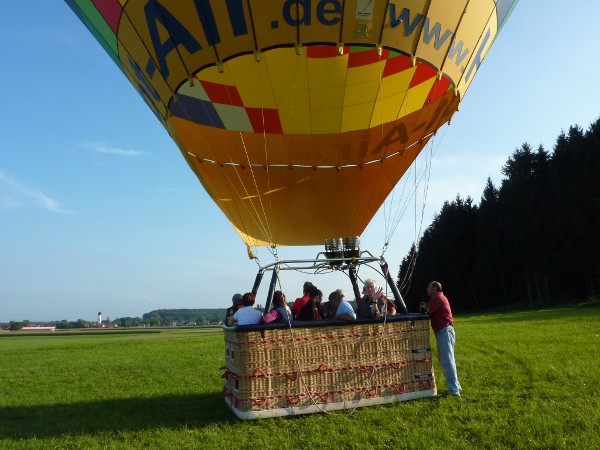 Diese Ballonfahrt fand nun, relativ kurzfristig vereinbart, am 22. September 2011 bei schönem, herbstlichen Wetter statt. Elf Passagiere versammelten sich zunächst am frühen Nachmittag am gemeinsamen Treffpunkt in Eching am Ammersee, von wo aus es mit zwei Fahrzeugen gemeinsam zum Startplatz bei Erpfting nahe Landsberg ging. Es herrschte an diesem Tag Westwind; da die Fahrt über die oberbayerischen Seen gehen sollte, musste der Startplatz in ausreichender westlicher Entfernung vom Wunschgebiet liegen. Als eine geeignete abgemähte Wiese gefunden war und der Aufstiegsverlauf durch zwei kleine Testballone zur Zufriedenheit des Ballonführers und hauptberuflichen Lufthansa-Piloten Jürgen Fels ausfiel, mussten alle Teilnehmer mithelfen, den großen bunten Heißluftballon auszupacken, der Länge nach auf der Weise auszulegen, ihn beim Füllvorgang festzuhalten und ihn schließlich an den Korb zu befestigen. Dann ging alles sehr schnell: alle elf Gäste mussten zügig in den Korb klettern und schon ging es, um exakt 17.30 Uhr, kaum merkbar, sanft und lautlos nach oben.