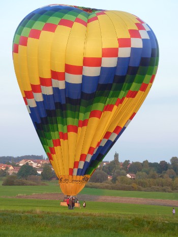 Kurz nach der Landung des Ballons am Abend. Einige Passagiere sind schon ausgestiegen, die übrigen mussten noch einige Minuten im Korb warten, bis die Luft im Ballon abgekühlt war, da er sonst sofort wieder aufgestiegen wäre.