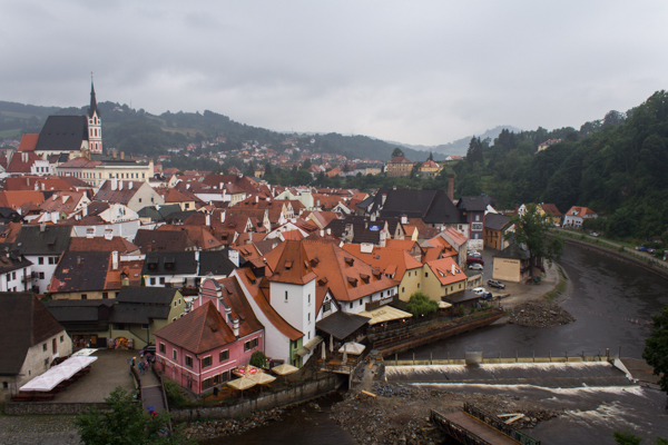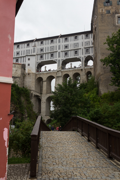 Frisch gestärkt stiegen wir hinauf zur Burg Krumau. Von der berühmten Mantelbrücke, einem dreigeschossigen Verbindungsgang zwischen Residenz und Garten, bot sich dann ein stimmungsvoller Blick über das verregnete Krumau. Auch die Laune war trotz des schlechten Wetters prächtig.