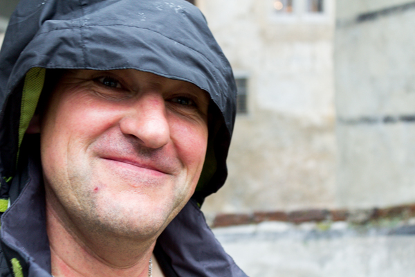 Bilder v.l.: (1) Die dreistöckige Mantelbrücke verbindet das Schloss mit dem Schlossgarten und dem darinliegenden Theater. (2) Blick von der Mantelbrücke über die verregnete Altstadt von Krumau. (3) Dieter lässt sich von ein wenig Wasser die Laune nicht verderben.